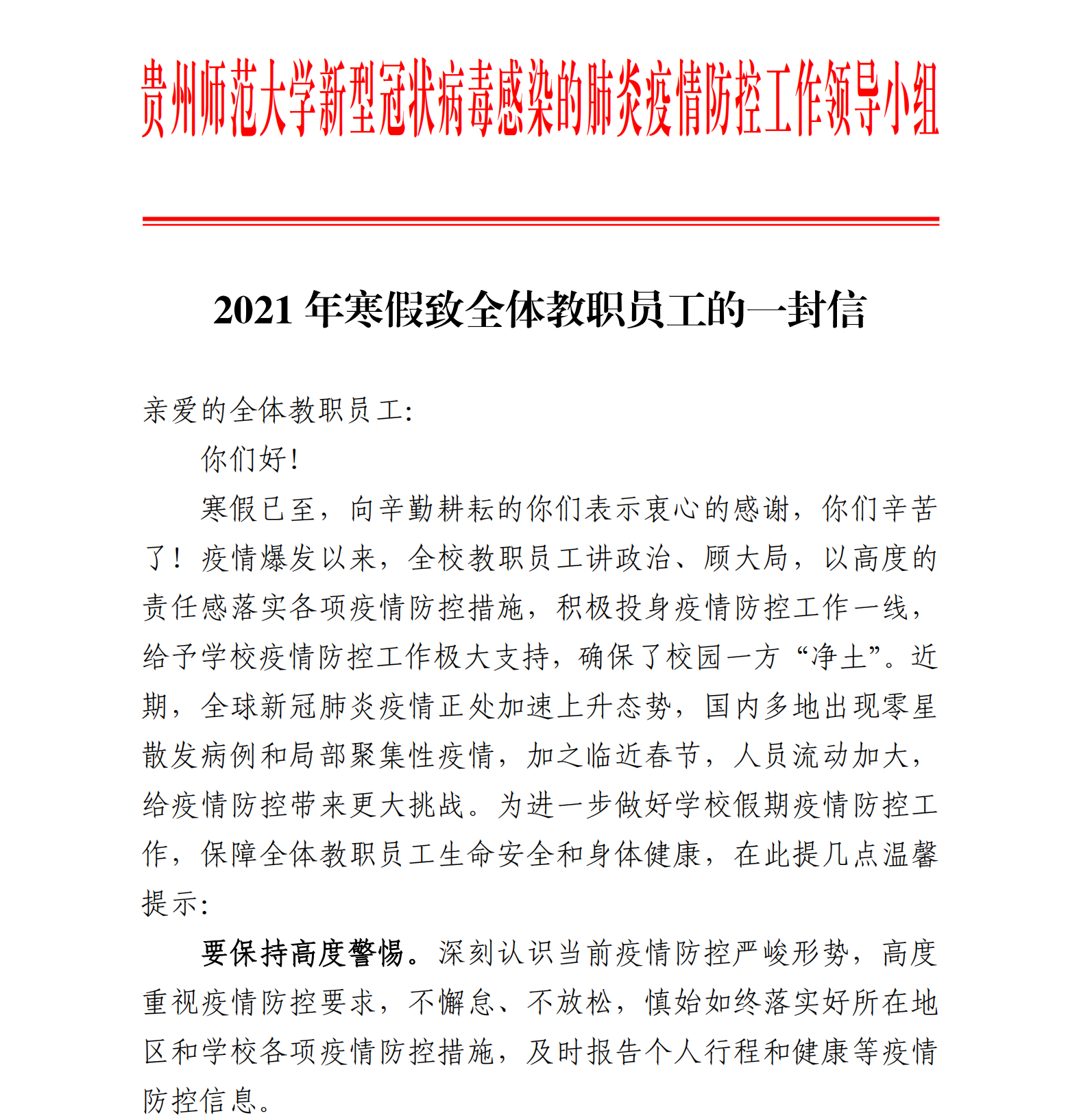 2021年寒假致全体教职员工的一封信