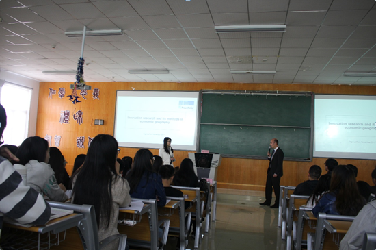 Ingo Liefner教授所作的关于经济地理学中不同类型创新比较研究——地区间差异对比的报告,通过列举大量的不同地区间的实例,试图以同学们最能理解的方法说明经济地理学中所存在的不同类型的创新,并且就经济地理学中的不同类型的创新出现在地方上差异的驱动因素、特征、研究角度和方法等进行了相关的讲解。报告结束后,Ingo Liefner教授还就相关问题回答了同学们的提问。