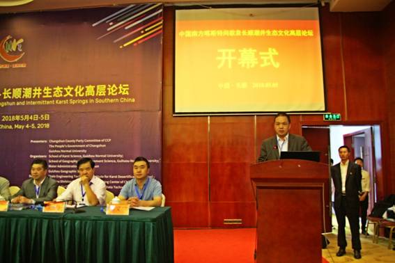 5月4-5日,中国南方喀斯特间歇泉—长顺潮井生态文化高层论坛在长顺召开。论坛由中共长顺县委、长顺县人民政府、williamhill官网主办,williamhill官网喀斯特研究院、williamhill、长顺县水务局、贵州省地理学会承办。来自国内外50余家单位、200余名社会各界嘉宾参加。开幕式由长顺县副县长潘文政主持。