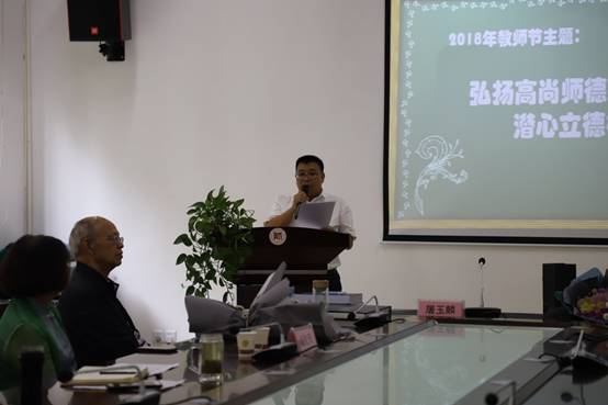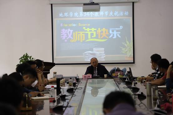 为隆重庆祝第 34 个教师节,进一步推进师德建设,在全院营造尊师重教的氛围,弘扬尊师重教的良好风尚,激励公司教师热爱教育事业,积极进取,开拓创新,9月7日,地理与环境科学公司党委在花溪校区地环楼3309会议室开展 “弘扬高尚师德 潜心立德树人”庆祝2018年教师节暨主题党日活动。公司副董事长杨胜天,公司退休老教授、“全国优秀教师”屠玉麟受邀出席。公司全体教工党员和教师参加。活动由公司党委书记杨建红主持。