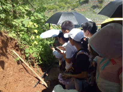 短暂的休息后,我们进入了桔乡花海参观学习,陆晓辉老师为同学们介绍了园林土壤的基本要求、质地及肥力,并选择土壤剖面点进行观察,了解各类土壤的分布特点和土壤资源的改良利用方向,同时认识和鉴别土壤的质地、酸碱性、类型等。