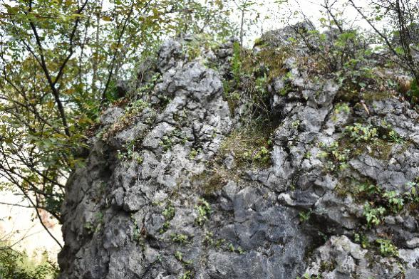 基岩-土壤的性质对植被有明显的制约作用 ,植被分布的地带性规律退居次要地位,而非地带性植被类型则较突出。由于石灰岩在该区域大面积分布,石灰岩风化后形成的土层浅薄、干燥、地表缺水、土壤中性至强碱性等特殊生境条件, 使其如贵州广大地区一样发育了特殊的植被类型— 岩溶植被 (喀斯特植被 ) ,其具有适钙性、耐旱性和石生性的三大特征。在九洞天区域可见以月月青(Itea ilicifolia Oliv.)圆果化香树(Platycarya longipes Wu)、蜡梅(Chimonanthus praecox (Linn.) Link)、青檀(Pteroceltis tatarinowii Maxim.)、以及卫矛(Euonymus alatus (Thunb.) Siebold)为主的喀斯特植被。在峨眉山玄武岩的碎屑岩酸性土地区 , 则可见多发育了较典型的以青冈(Cyclobalanopsis glauca (Thunb.) Oerst.)、栲类等为主的亚热带常绿林及次生的暖性针叶林——云南松林。