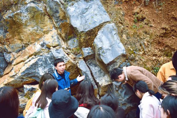 作为一名未来的地理老师,应有一双观察地理事物的慧眼,有思考地理现象背后缘由的慧心。老师们沿途不断设置问题,以问导学。九洞天景区的标志性代表——枪杆岩是如何形成的呢?九洞天峡谷两岸石壁为何会呈现红色?为何会形成天生桥?九洞天洞口的钟乳石生长为何会拐弯?同学们都积极思考,在老师的指引下总结得出自己的看法。