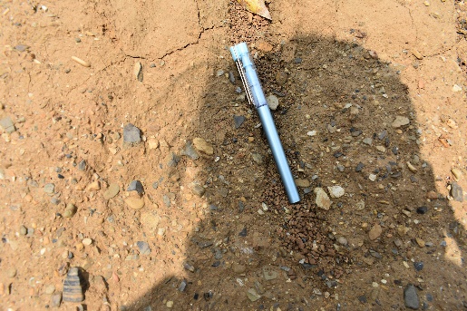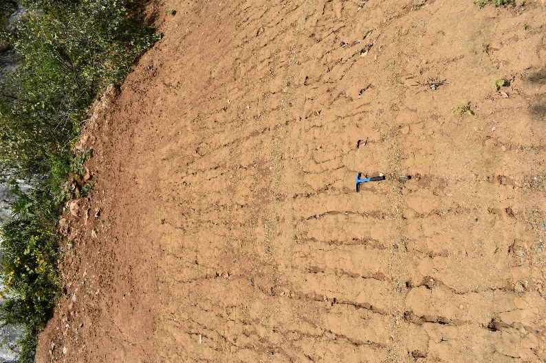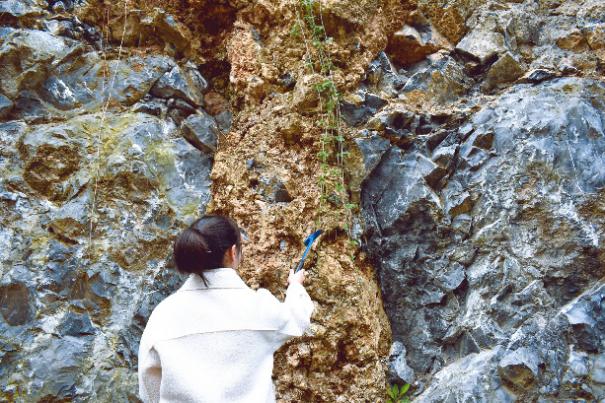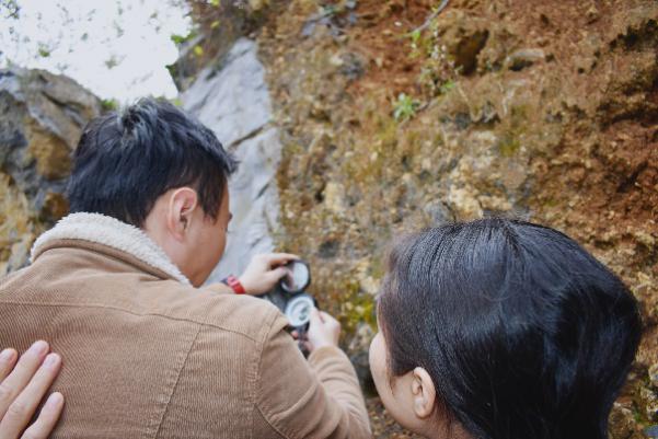地质罗盘是野外地质工作必不可少的工具,杨老师考虑到2019学科地理专业的同学专业背景不一,悉心指导同学们使用地质罗盘测量产状。从选取典型层面,到测量、读数、记录等逐步指导同学。在老师的指导下,在同学们的相互学习中,大家熟练掌握了使用地质罗盘的方法。通过测量和观察,同学们发现该处地层主要呈南西走向。在此处,同学们还观察到了岩溶角砾岩,角砾大小相差悬珠、棱角清晰,胶结状态差,推测是碳酸盐岩因溶解而形成溶洞,溶洞顶壁崩落而形成石灰质角砾堆积,进而被钙质或红土胶结所致。