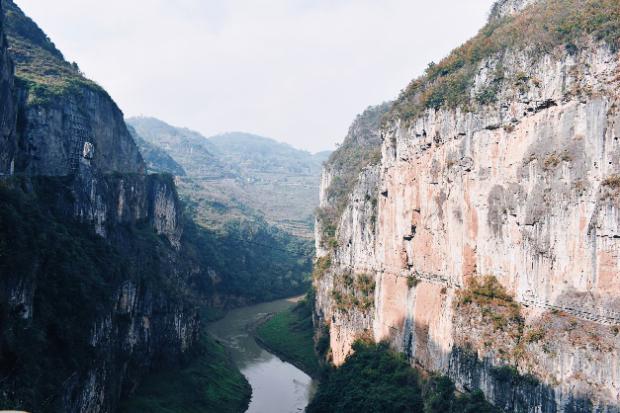 在前往九洞天的路上,老师们都在不断地提醒同学们注意窗外景观的变化。杨老师提醒同学们注意回忆课堂上的知识,贵州的石灰岩以哪两种为主?如何区分它们?九洞天地区的石灰岩是哪种?同学们根据课堂上学习的“黑栖霞,白茅口”的口诀判断出九洞天地区的石灰岩是茅口组地层。沿途老师让同学们思考九洞天地区内的如图所示河谷段属于什么喀斯特峡谷类型,提示同学们课外查看公司杨明德老先生关于喀斯特峡谷的相关文献论述。喀斯特峡谷是一个物质、能量作用的特定地域系统,表现为三种地貌营力过程——下切侵蚀作用、溶蚀作用和崩塌作用(包括塌陷)在特定空间尺度上的耦合,而且在喀斯特峡谷不同发育阶段三种作用过程的强度对比会发生变化,并导致不同峡谷形态——成因类型的出现和地域结构上不同形态类型的镶嵌,即隙谷、嶂谷、峡谷、箱形谷及双结构的峡谷(峡谷叠置箱形谷、峡谷叠置嶂谷、宽谷叠置峡谷或箱形谷) 在河流不同地段出现。九洞天位于黔北台隆,处于高原剥夷面,河流的下切作用和造山运动使得水的切割比较深,峡谷也比较深,从形态上来看该段峡谷属于箱形谷。由于喀斯特峡谷一般都是处于地面抬升、侵蚀基面不断下降和河流强烈下切过程中,谷区形成水系变迁,注入峡谷的两岸地表水系,因喀斯特“向深发育”渗流带增厚垂直渗透强化,使水系在向峡谷汇流过程中逐渐失能衰退,代之而起的是地下水系的强化和集流,从而造成地表汇流结构的解体和地下汇流结构的产生,这就造成喀斯特峡谷地貌的双重结构。在此处河段还可以观察到形成了一定长度的伏流、地下河、溶洞,其正是喀斯特峡谷地貌发育的典型代表,在长不到 6 km,由伏流、明流箱形谷、明暗交替达 9 次的九洞天段组成。峡谷两侧石林峰林耸立,谷壁如削 ,而且两崖可见成层溶洞,大家通过推测认为每层溶洞应该于同一时期发育,其可能是受到地壳抬升作用,成层的溶洞也可间接反映出地壳抬升的次数。在九洞天景区内发现的古河道也可与其相互印证。