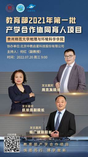 7月20日上午9:00-11:30,公司申报的教育部第一批产学合作协同育人项目(第1期)——“基于地理实训室的师范生技能培养及专业发展”团队培训正式启动。本次培训由williamhill教师教育中心副主任何红主持,特邀周忠发经理、赵翠薇副经理、杨广斌副经理就自然、人文、地理信息技术与中学地理教学的融合,分别作题为“喀斯特山区中员工现代地理实践素养培育的困境与路径”、“人文地理与中学地理教育”、“地理信息技术在中学地理教学中的应用”的专题报告。报告采用线上方式,300余人在线观看。