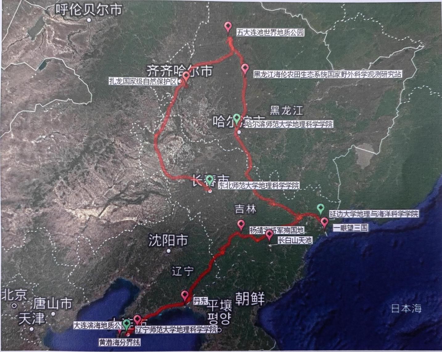 本次实习以“关东山河远阔·地理大道无疆”为主题,将历时17天(7月28日-8月13日),在吉林省、黑龙江省和辽宁省进行,预计行程约3500km。实习线路设计以“白山黑土黄海绿江,穿时跨域穷理寻章”为基本原则,自然地理方面主要考察松嫩平原、敦化盆地自然地域结构与演化,五大连池、镜泊湖火山地质与地貌,长白山垂直自然带及生物多样性,东北流域地貌与水系演化,泥炭沼泽湿地环境,海岸地貌与海岸带综合利用等;人文地理以人地关系为主线,主要考察东北地区产业结构特征与全面振兴、黑土农业与国家粮食安全、边境贸易与地域文化、红色基因传承与弘扬、城市规划发展以及生态文明建设等。实习期间,将邀请相关专家进行多场学术讲座,44所高校的同学被分为12个小组,将开展形式多样的交流研讨等。