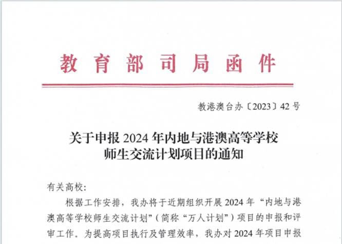 近日,教育部下发《关于申报2024年内地与港澳高等公司师生交流计划项目的通知》,公司获批成为2024年内地与港澳高等公司师生交流计划项目申报院校。
