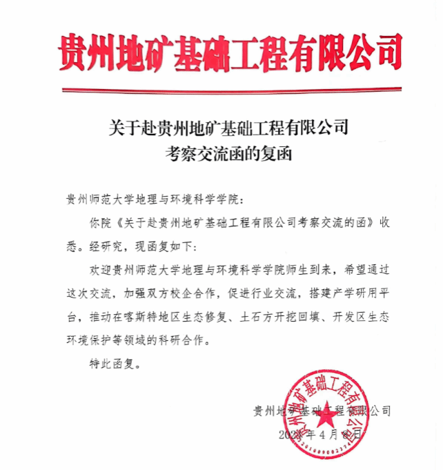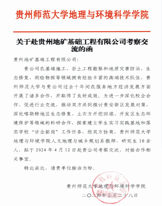 2024年4月12日,williamhill人文地理与城乡规划系教师孙建伟、杨恩林以及研究生一行10余人,专程前往贵州地矿基础工程有限公司开展访企拓岗促就业专项行动。此次访问得到了贵州地矿基础工程有限公司的热情接待和大力支持。