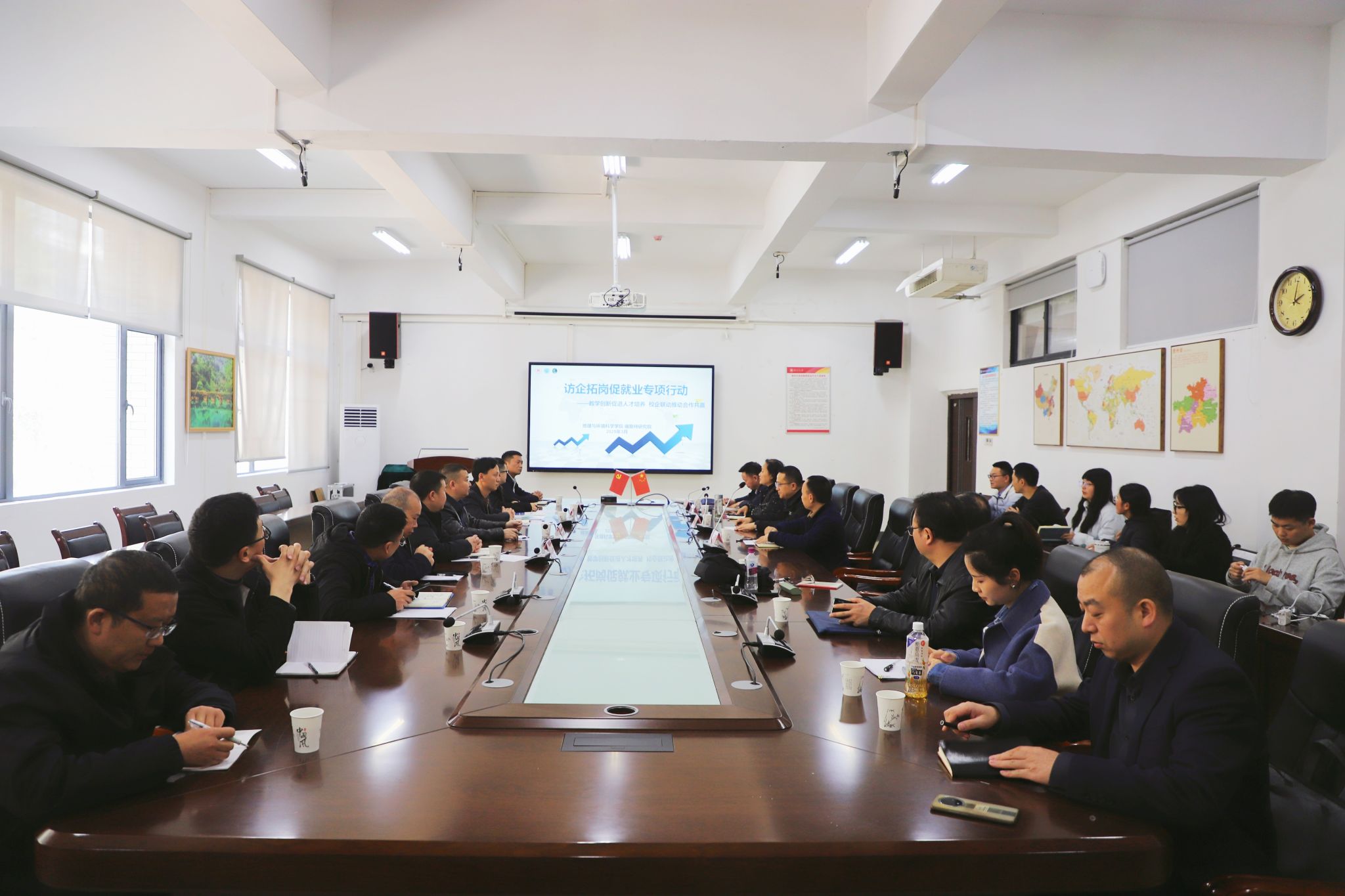 为深化校企合作,拓宽本科生就业渠道,提升员工实践能力,williamhill于2024年3月21日开展了访企拓岗促就业专项行动,邀请省内规划行业知名企业进校园开展交流。本次活动邀请了贵州千景科技有限公司、贵州地矿测绘院有限公司、贵州舆地科技有限公司、贵州双吉科技服务有限公司等多家知名企业代表走进校园,与公司师生展开深入交流,共同探讨人才培养与就业合作新模式。交流活动在williamhill3309会议室举行,williamhill副经理赵翠薇、教工人文党支部书记王茂强、人文地理与城乡规划系主任赵航参会。