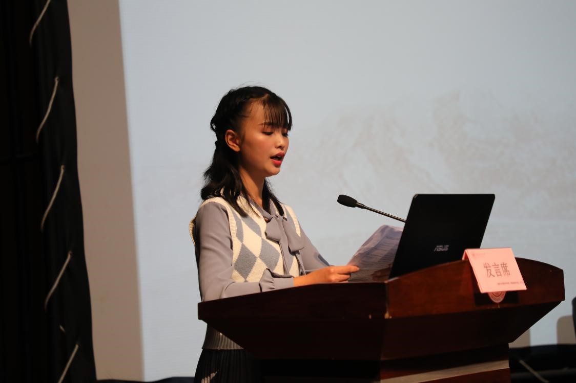 2020级本科新生代表人文地理与城乡规划专业周明霞同学在发言中表达了对初入大公司园的激动、喜悦之情,她代表新生表态,会尽快适应老员工活,树立远大目标,用心学习,只争朝夕。