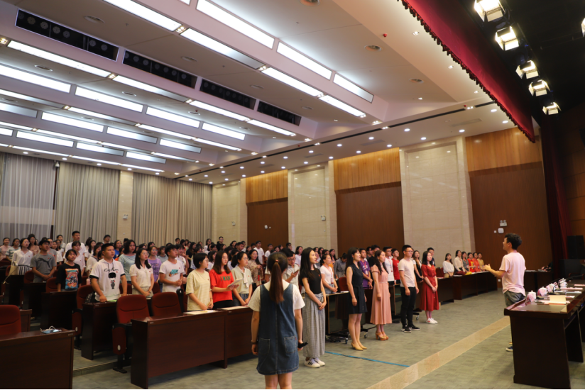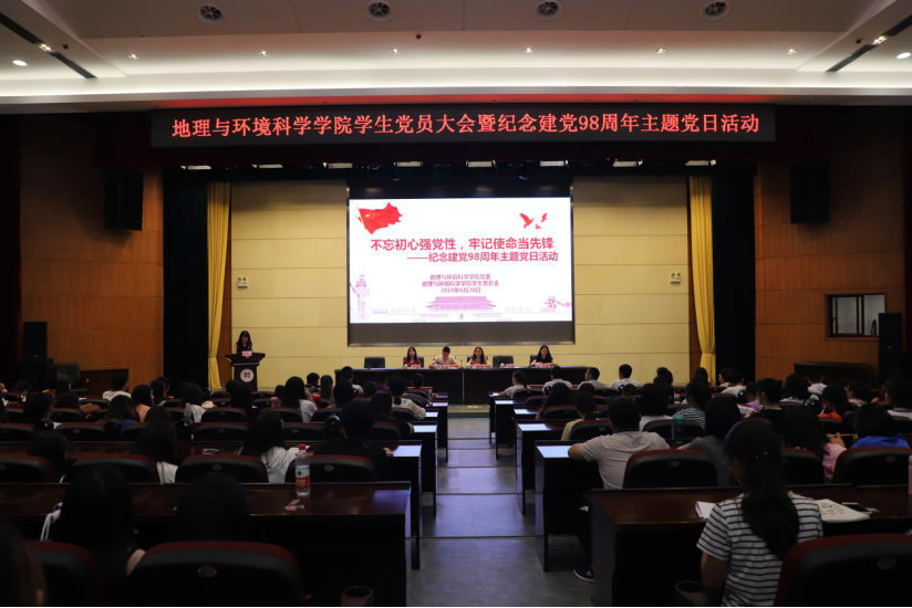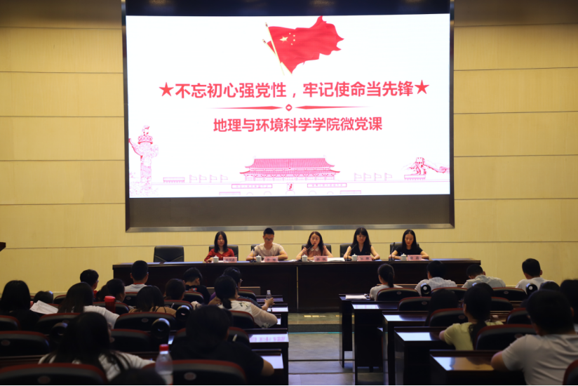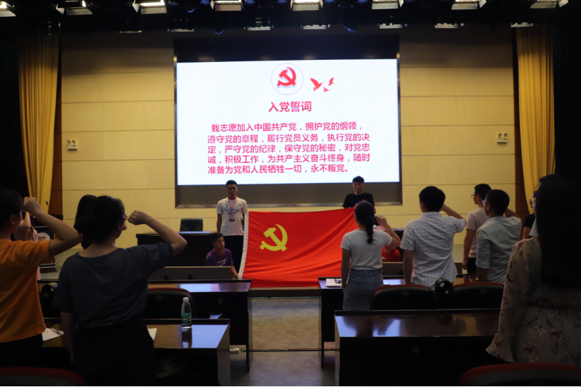 在新党员宣誓、老党员重温入党誓词环节,由朱琳领誓,郭锐监誓,全体党员举起右拳面对党旗庄严宣誓。随后,16土管班李胜鹏作为新党员代表发言;李维宣读2018年度优秀党支部和优秀党员的表彰文件;公司领导和老师分别为新党员进行党员寝室授牌。