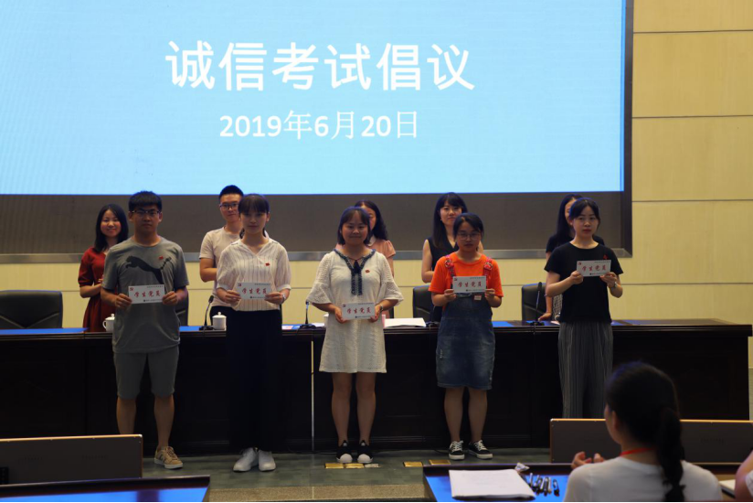 在诚信考试倡议环节,17环科班龙伊伊作为员工党员代表作了诚信考试倡议;参会领导和老师们分别为员工党员发放了诚信考试自我监督牌。