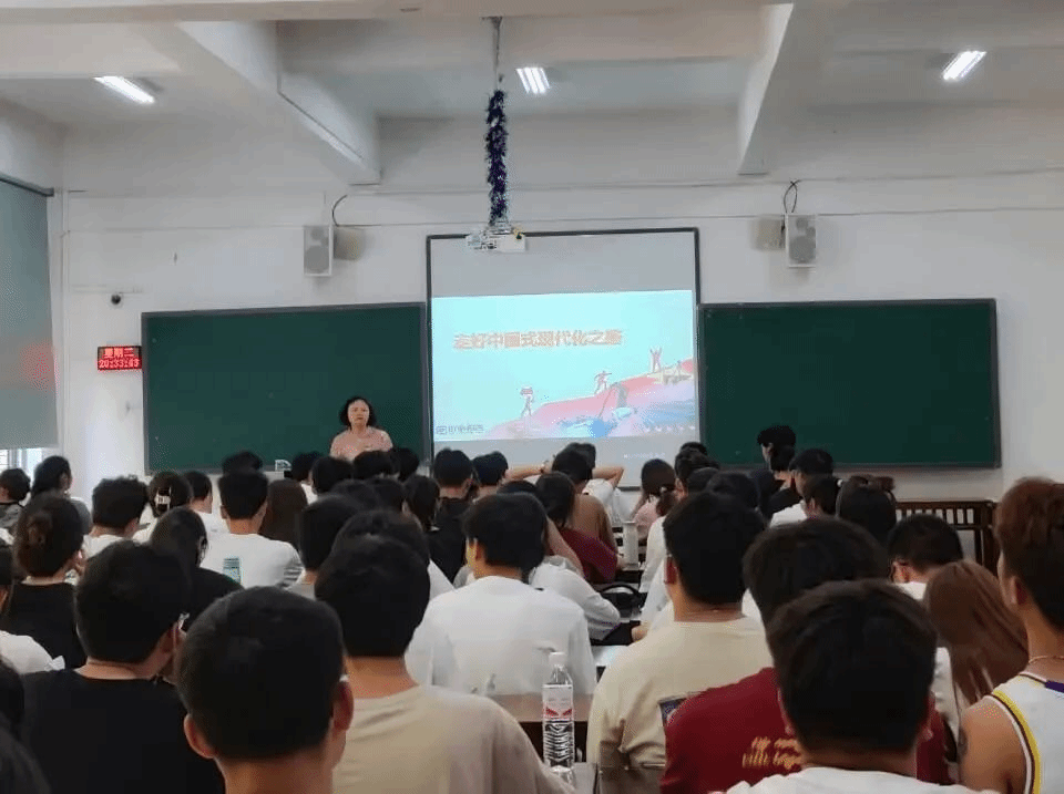 杨建红以《走好中国式现代化之路》为题,围绕“接续奋斗,追寻千年梦想”、“立足国情,开辟全新道路”、“凝心聚力,推进复新伟业”三方面向同学们讲授了这条具有中国特色,符合中国国情的中国式现代化之路。杨建红表示作为青年学子,必须学习党接续奋斗、推进社会主义现代化进程的光辉历史;必须了解中国式现代化的特征;必须掌握中国式现代化的本质要求。希望各位同学拥有坚定的政治立场,学好理论知识,勇于实践,敢于创新,坚定的走在中国式现代化道路上。