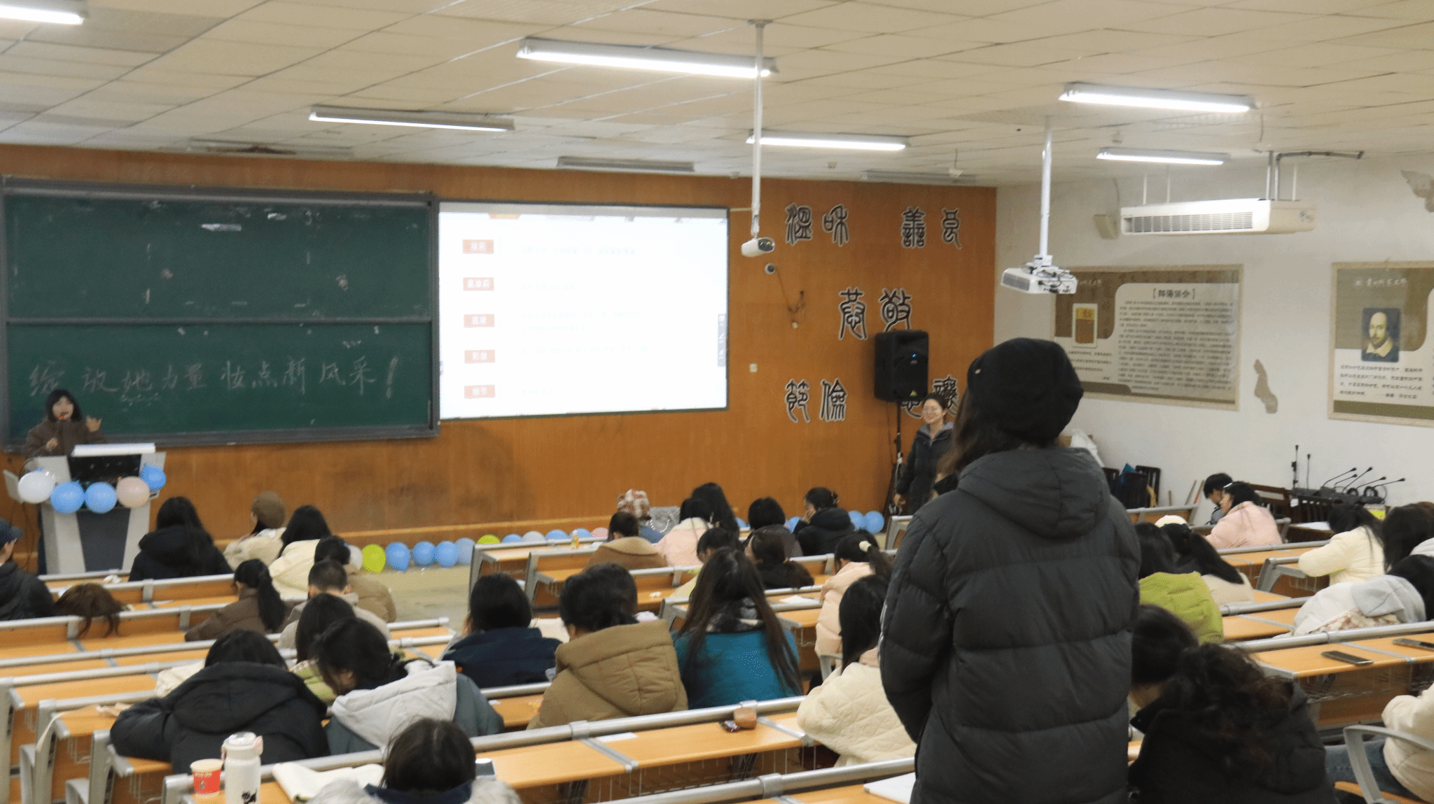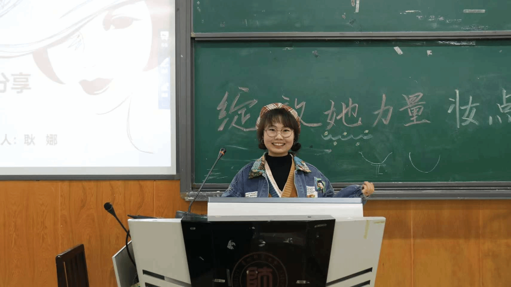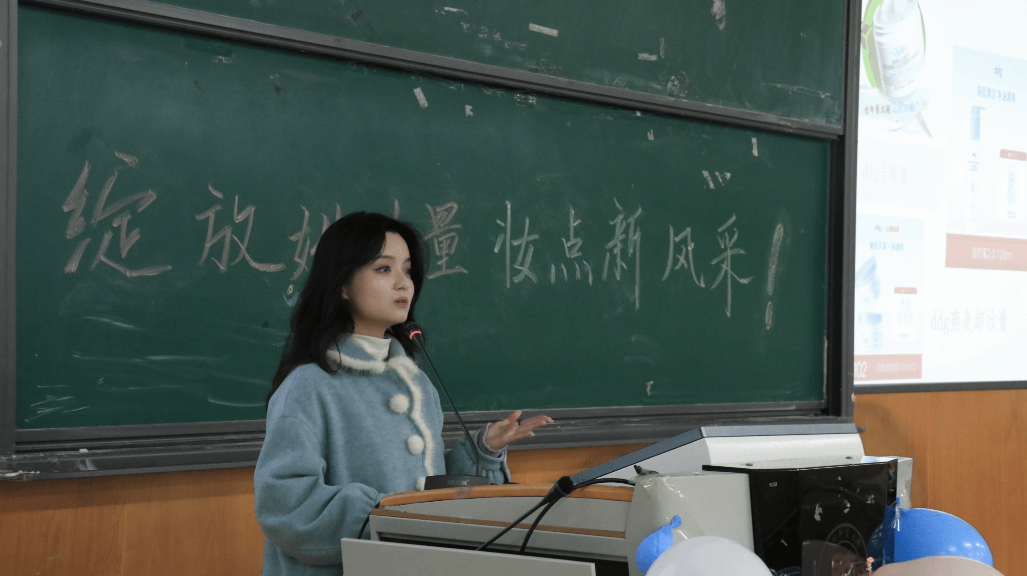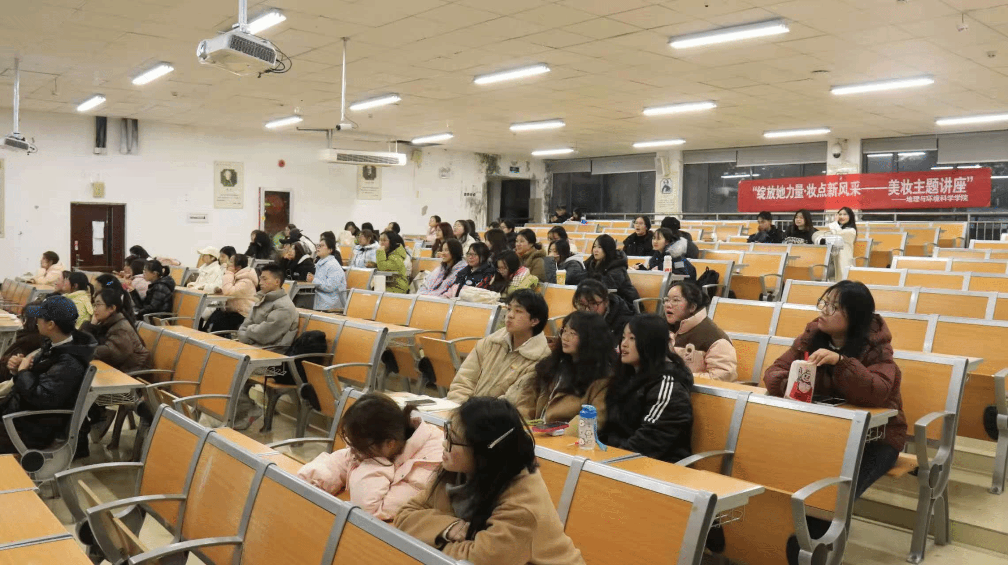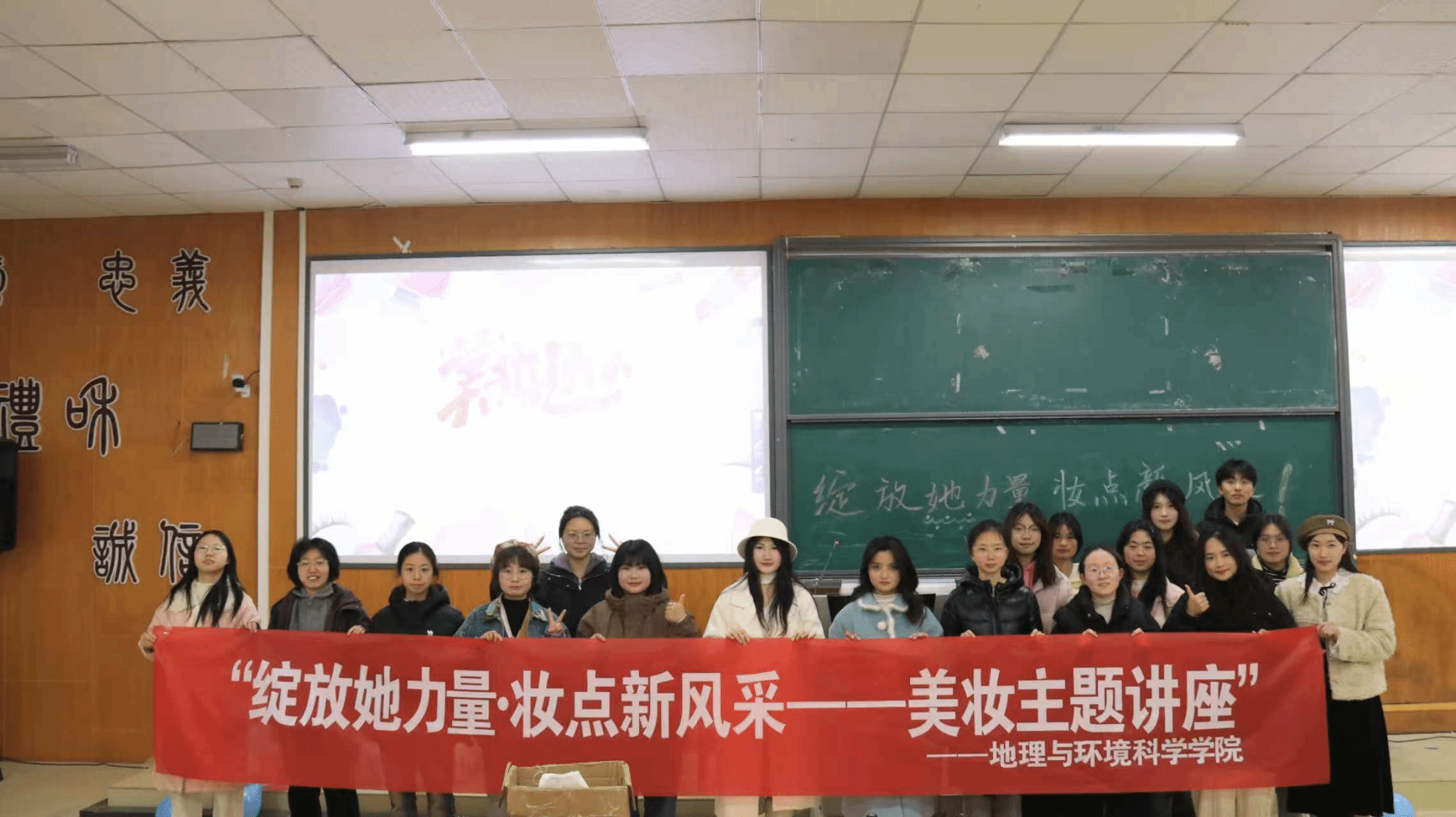 当樱花初绽的春夜邂逅美妆盛宴,3月6日晚,由院员工会主办的女神节美妆讲座在3501教室举行。本次讲座邀请了22地科班耿娜、22人文班杨玉婷、23人文班姚玲、龙怡冰作为主讲嘉宾进行美妆技巧分享、穿搭法则解析、造型艺术互动,为现场的88名同学带来了一场沉浸式的美学体验。