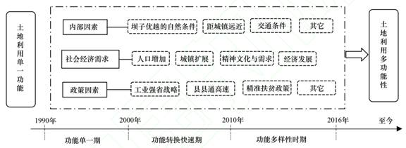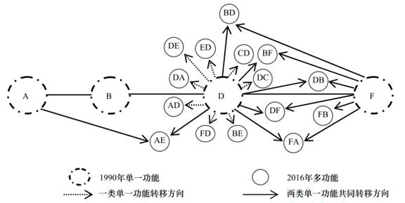 研究发现:(1)贵州省坝子土地利用功能已由以传统农业生产功能为主转为以传统农业生产功能-农村居住生活功能为主,坝子土地利用由单一功能向多功能转变;(2)1990—2016年,坝子功能类型增加10类,其中8类是复合类型,坝子功能向多样性转变;(3)单一功能与复合功能坝子比例变化曲线呈“X”型,到2016年,复合功能坝子比例大于单一功能坝子;(4)1990—2000年,坝子土地利用功能变化缓慢,2000年以后坝子土地利用功能变化强烈;(5)传统农业生产功能转移最为强烈,主要转移为城镇居住生活功能、农村居住生活功能、工业生产功能及与之相关的复合功能和自然生态功能;(6)各种功能类型坝子冷热点的空间分布变化复杂,从总体上看各功能的空间分布由集聚变为分散。