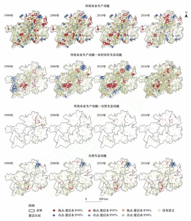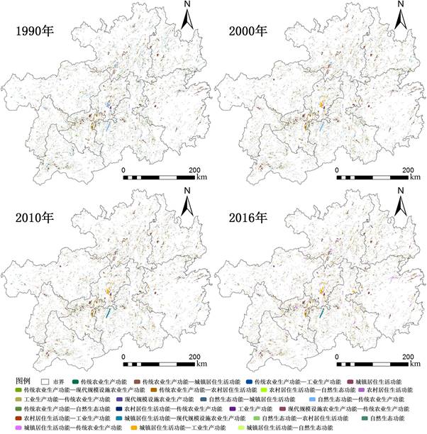 图2 贵州省1990年、2000年、2010年、2016年坝子土地利用功能空间分布格局