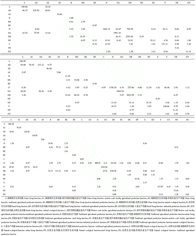 表2 1990年-2000年、2000年-2010年、2010年-2016年贵州坝子土地利用功能转移矩阵/km2