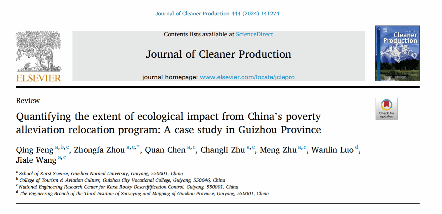 近日,公司周忠发教授团队在生态环境学领域1区TOP期刊Journal of Cleaner Production(IF=11.1)在线发表题为“Quantifying the extent of ecological impact from China's poverty alleviation relocation program: A case study in Guizhou Province”的研究论文。