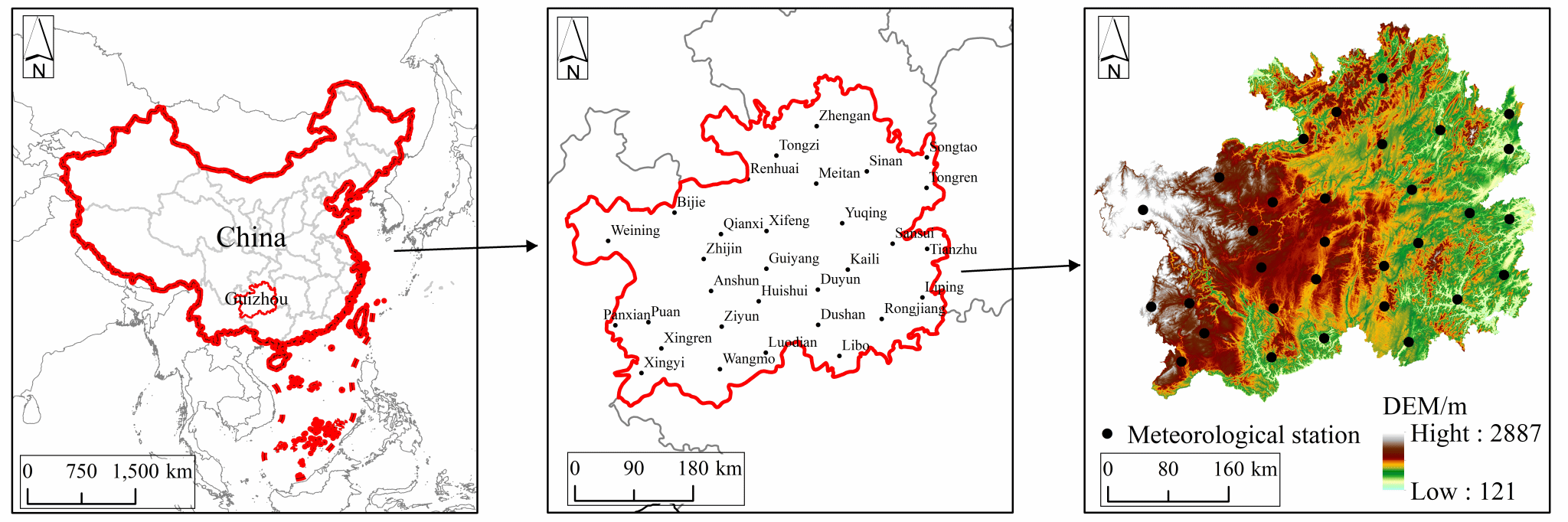 中国贵州省受来自太平洋的东南季风与印度洋的西南季风影响,降雨丰沛。但其下垫面结构复杂,降雨空间分布不均,易形成极端降雨,增加地质灾害发生的风险。研究以贵州省为例,从区域角度出发,分析不同下垫面条件下,历史、未来两个时期贵州省极端降雨特征及其对气温变化的响应,为气温变化背景下区域防灾减灾提供决策依据。