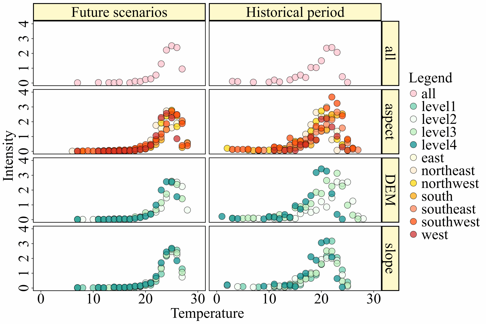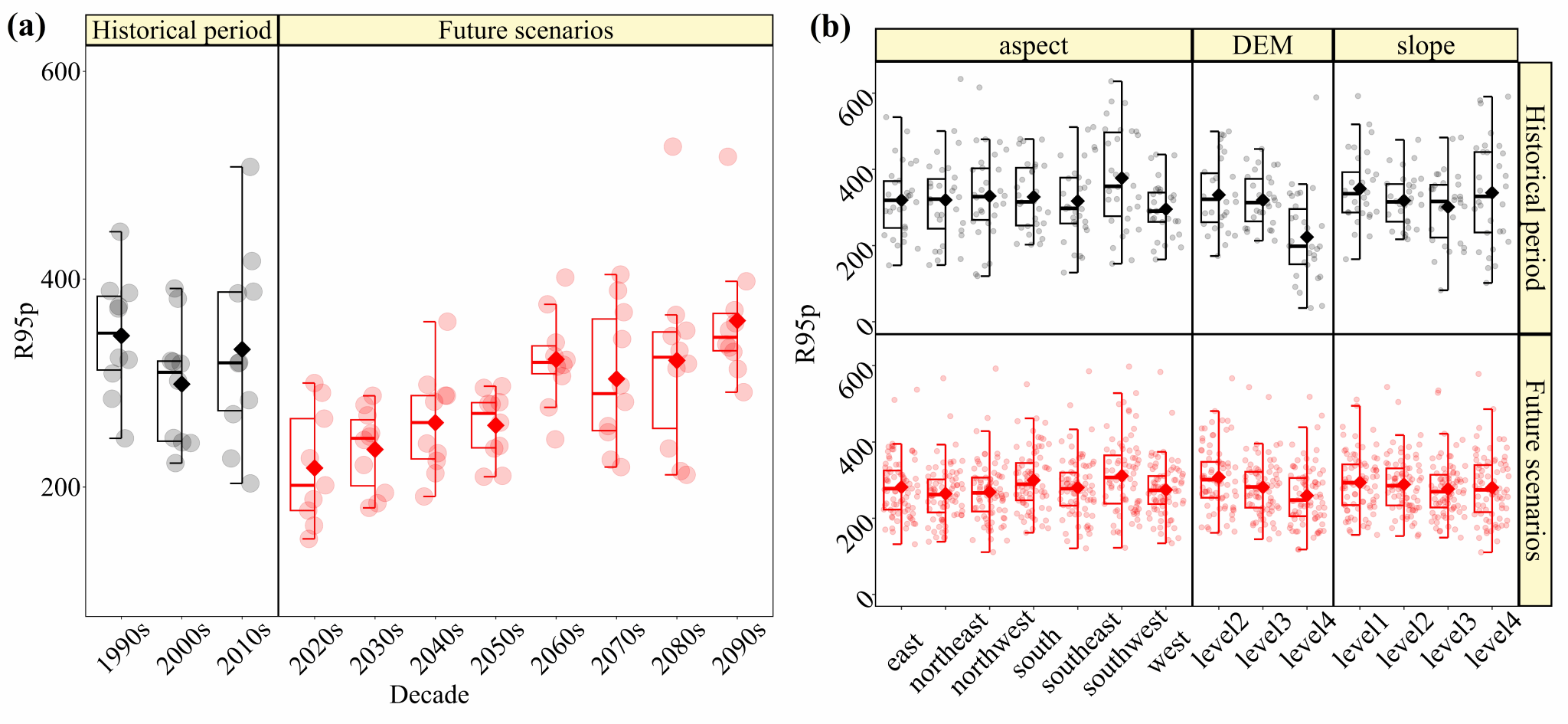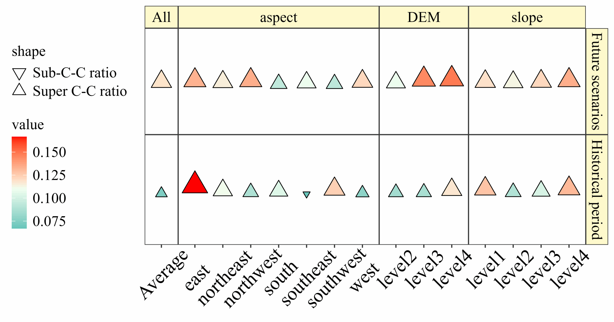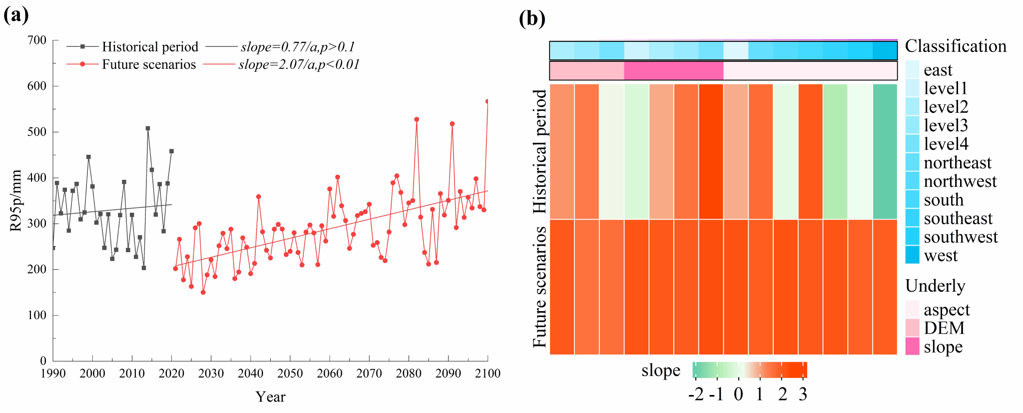 成果简介:不同时期、不同下垫面条件下极端降雨表现出不同特征,其对气候变化的响应也不同。贵州地形地貌复杂,降雨空间分布不均,易形成极端降雨,增加地质灾害发生的风险。针对贵州省极端气候的研究,大多关注其时空特征与模式数据预估,缺乏探究其在不同下垫面条件下,极端降雨变化特征及其对气温变化的响应研究。本文基于贵州省31个站点1990-2020、2021-2100年两个时期逐日降雨数据计算极端降雨,分析贵州省极端降雨时间、空间以及重现期特征,探讨极端降雨对气温变化的响应关系。结果表明:(1)贵州历史、未来两个时期极端降雨时间上均呈上升趋势,空间上分别呈“南高北低、东高西低”、“东南高、西北低”的分布格局;两时期极端降雨估计量均随重现期增加而增大,且各重现期下极端降雨空间分布都与非重现期一致;(2)贵州历史、未来两个时期气温均表现升高趋势,且两时期气温空间分布格局与极端降雨分布相似;(3)不同时期、不同下垫面条件下,极端降雨强度随气温升高的变化几乎都大于C-C率;极端降雨对气温变化均呈Hook响应结构,且气候响应结构会随气候变暖右移。研究结果可为气温变化背景下区域防灾减灾提供决策依据。