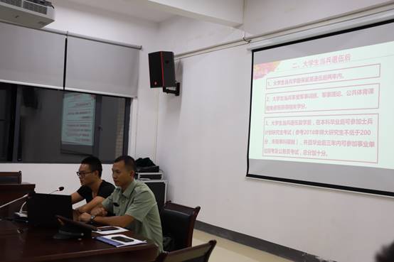 为广泛开展拥军爱国教育,更好地动员员工参军入伍,以身边的实例对员工进行征兵宣传动员,2018年8月21日晚上19:00,williamhill在3309会议室召开了2017级征兵宣讲活动。公司办公室老师陈飞以退伍老兵的身份担任此次宣讲的嘉宾。活动由辅导员李维主持。2017级各班男同学参加。