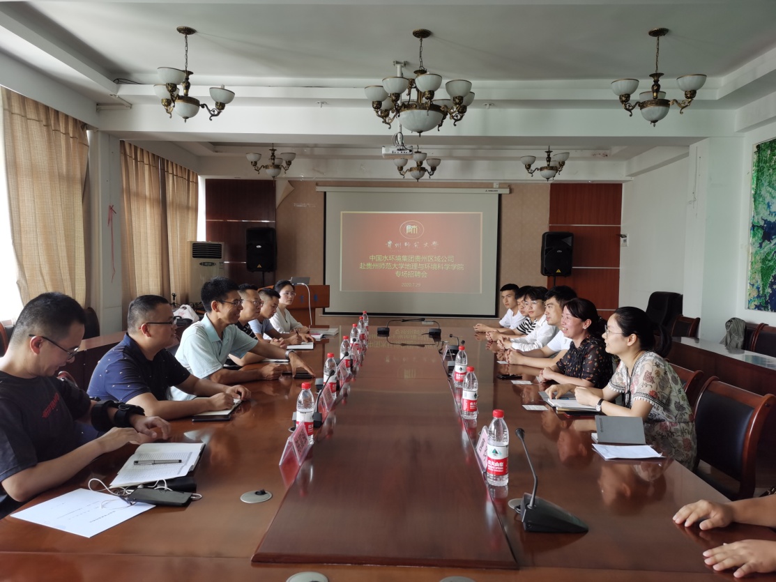 7月29日上午,中国水环境集团贵州区域公司副总曹效鑫、运营副总工蒋崇德、人力资源部经理陈富强等一行六人到公司开展专场招聘,2020届环境科学专业部分毕业生参加此次招聘,招聘会于宝山校区地理与环境科公司五楼会议室举行。