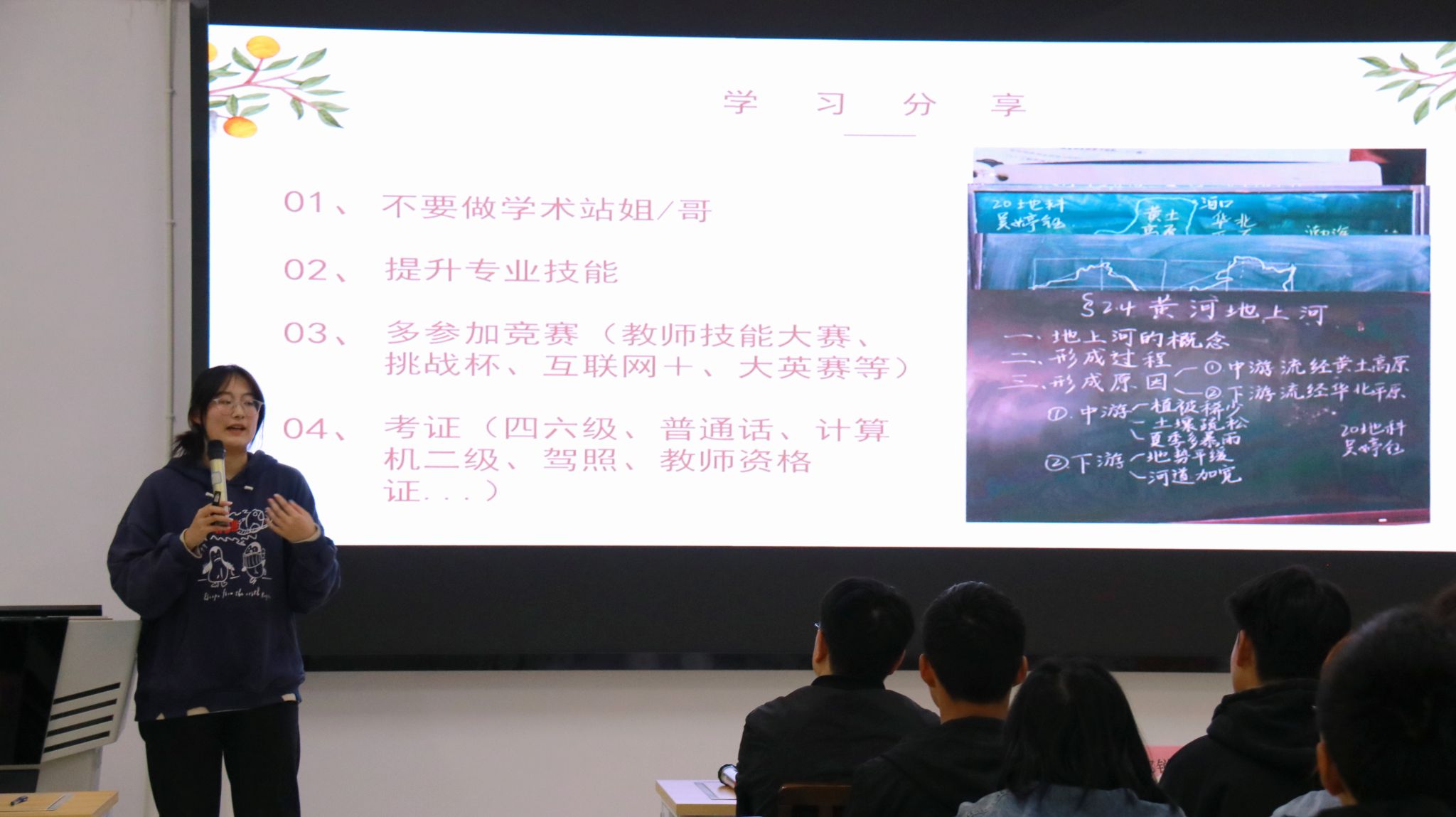 2020级地理科学专业本科生吴婷钰作为优秀寝室代表以《不做摆烂的老员工》为题进行分享,鼓励学弟学妹充分发挥寝室长作用,带领寝室成员热爱生活、关注学习、共同成长。
