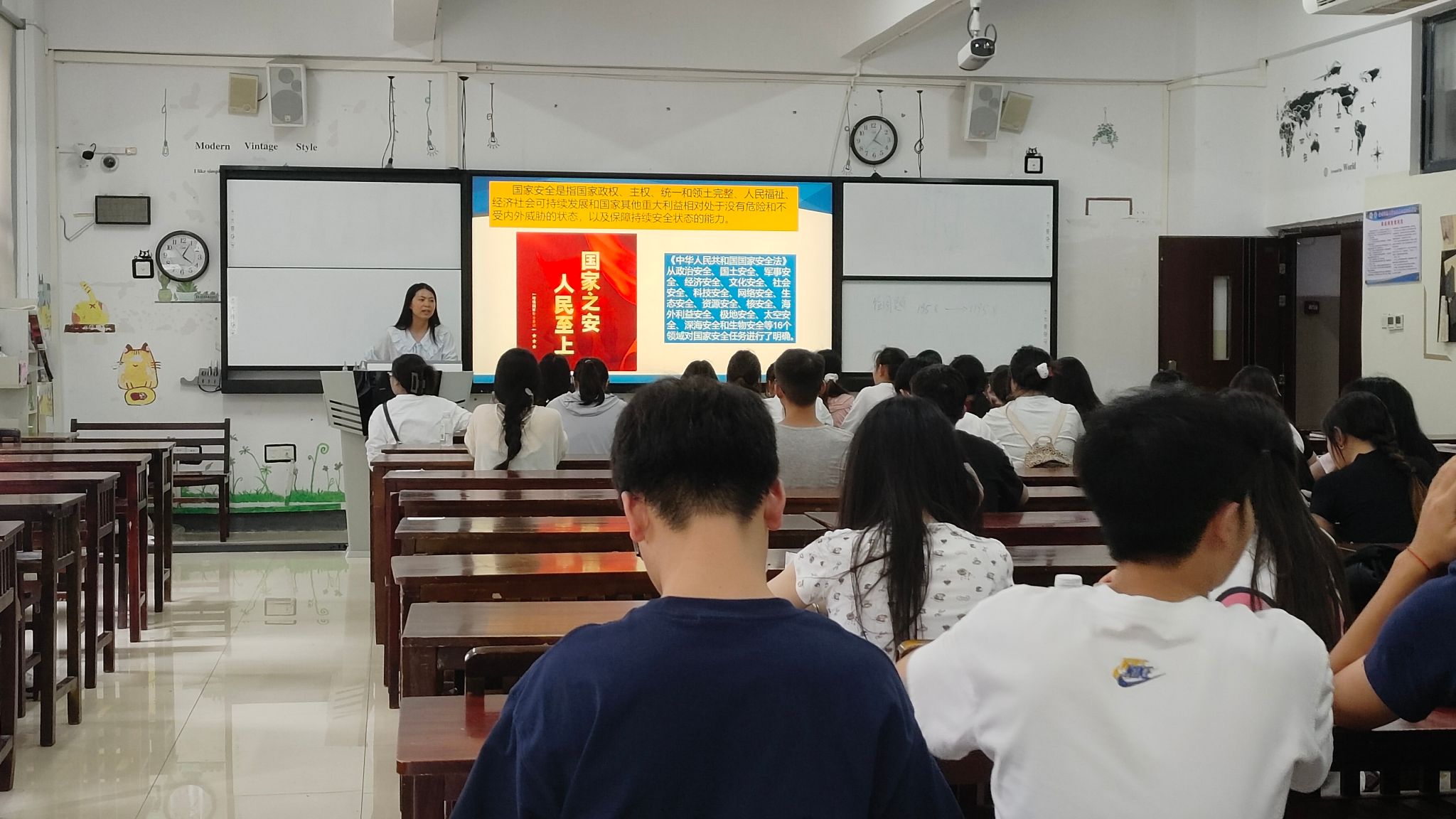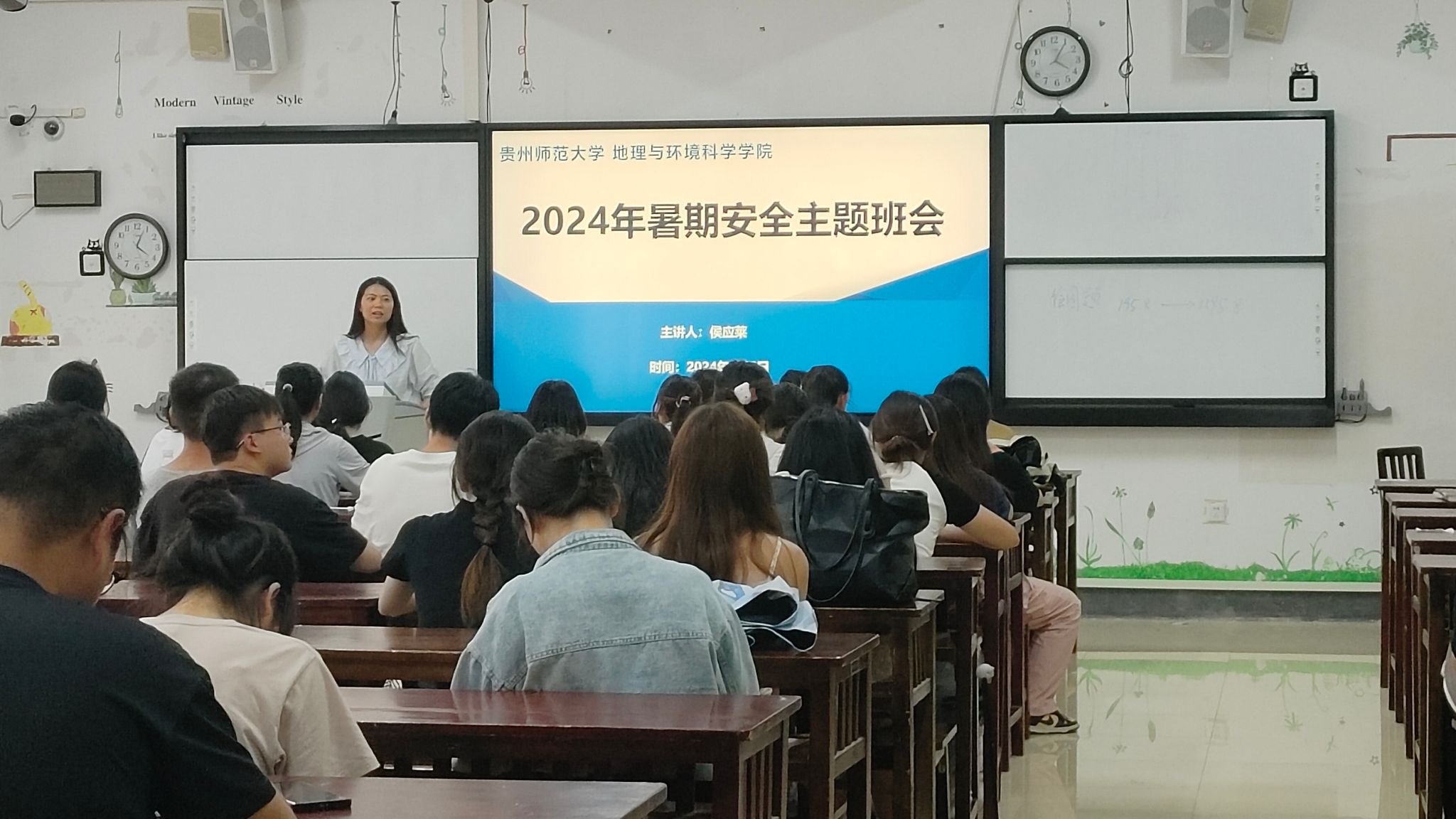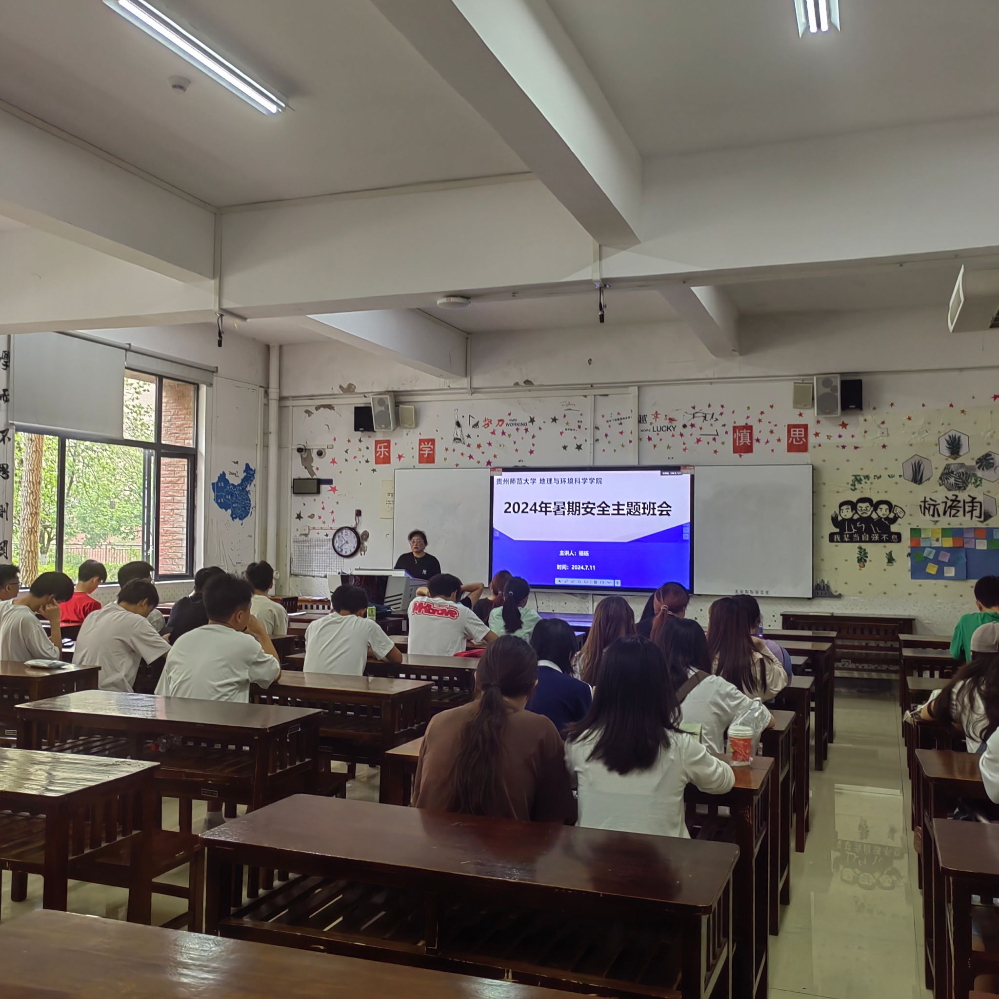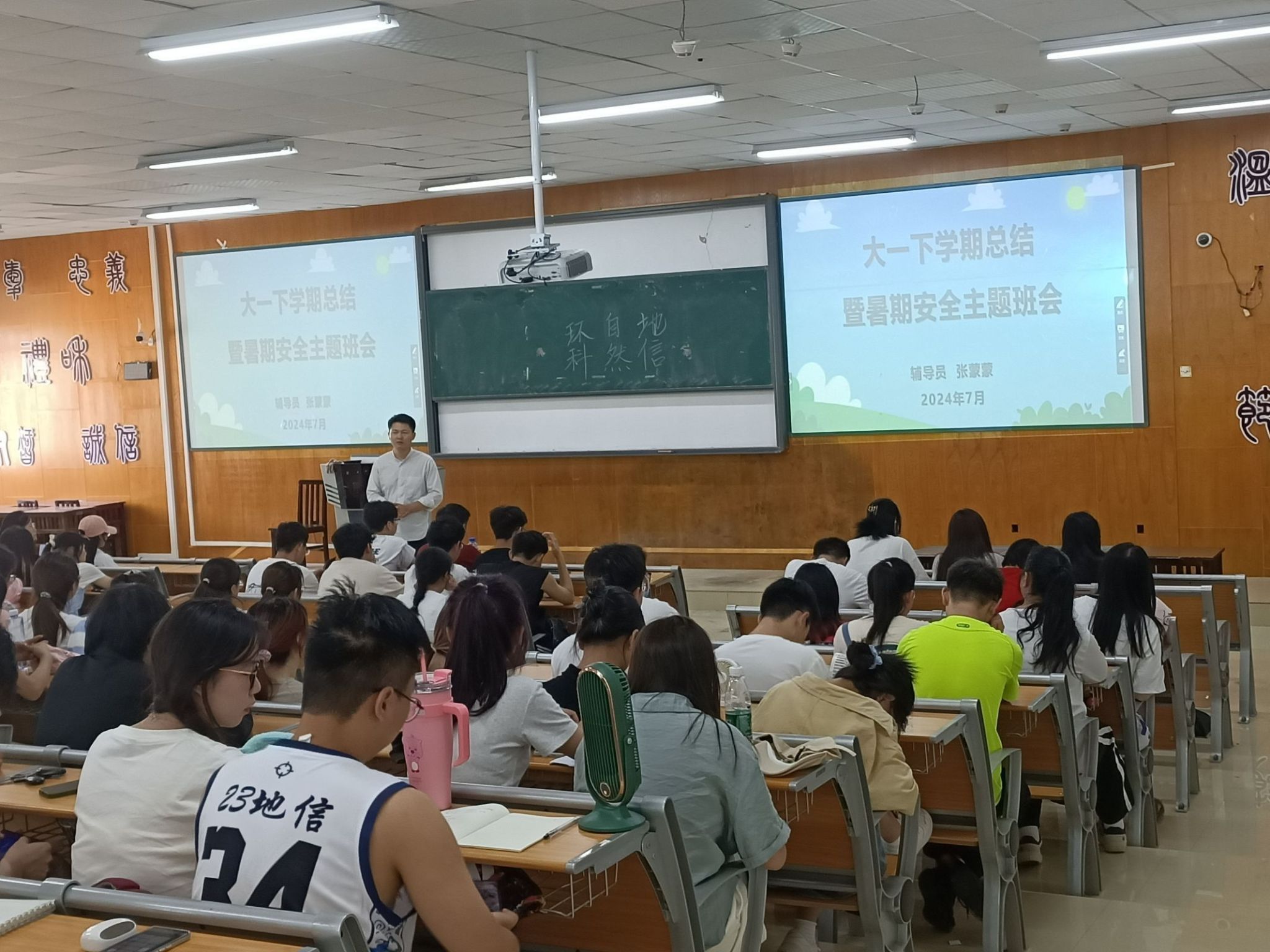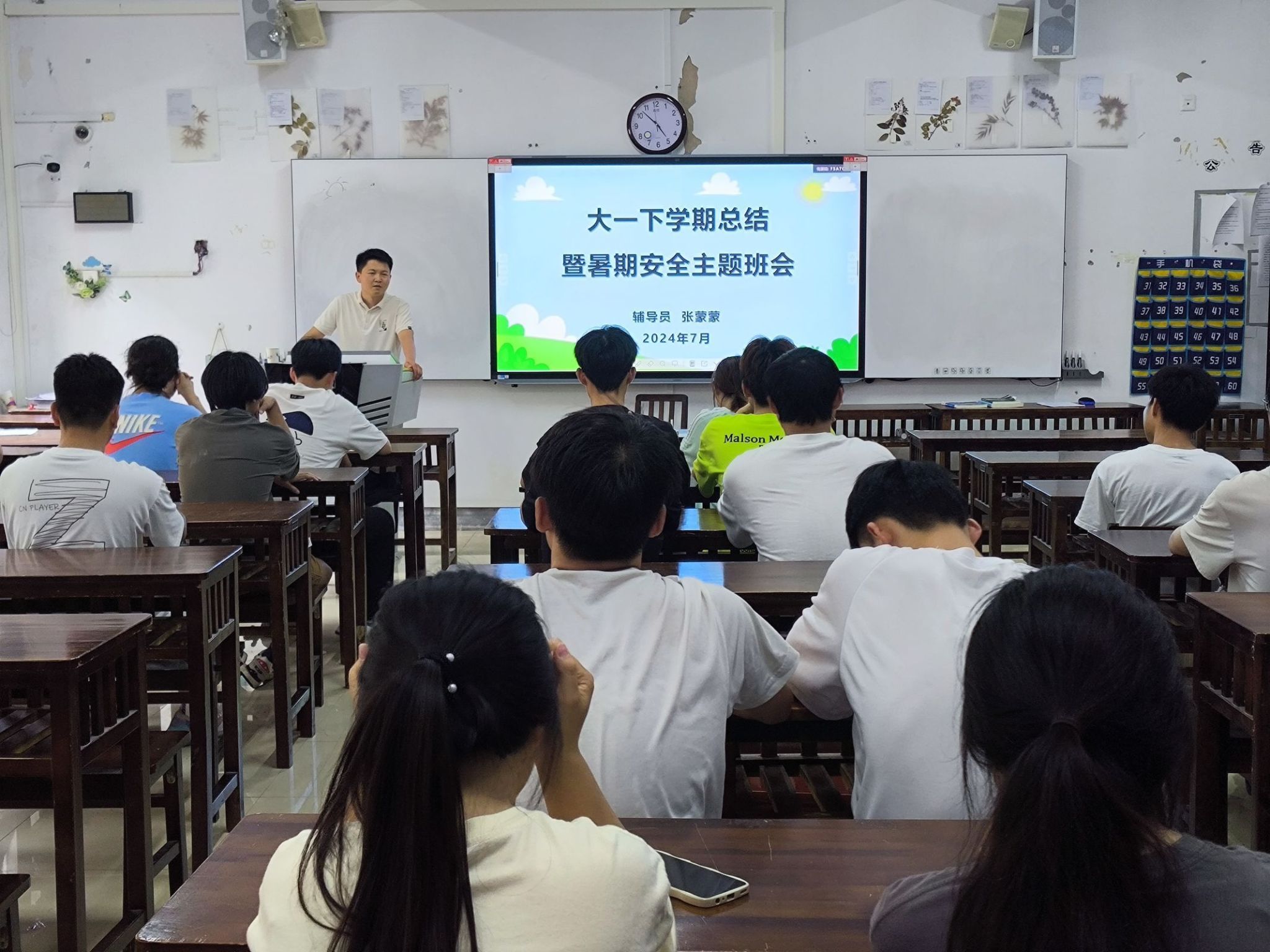 班会上,各班辅导员希望同学们利用好假期时间,制定计划,查缺补漏,总结本学期的得失,也为下学期的学习生活奠定基础。接着。从讲解国家安全入手,希望同学们假期警惕网络安全、溺水事故、交通事故、食物中毒、汛期意外、中暑等安全事宜。随后,结合身边案例提醒同学们预防电信诈骗。最后,叮嘱同学们离返校注意事项。