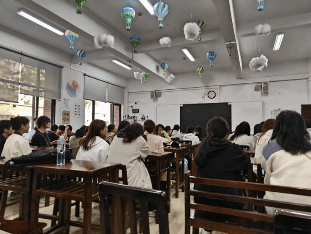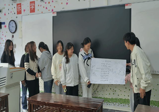 活动的最后一个环节——“四季之约与诗意共创”,志愿者们先将各班分成小组,每个小组内必须有分别出生在春夏秋冬的同学。接着,小组内讨论,用组内成员名字中的一个字,共创一首体现老员工活美好的诗。同学们发挥奇思妙想,一首首充满创意和温情的诗诞生,让同学们在创作中感受合作的魅力。