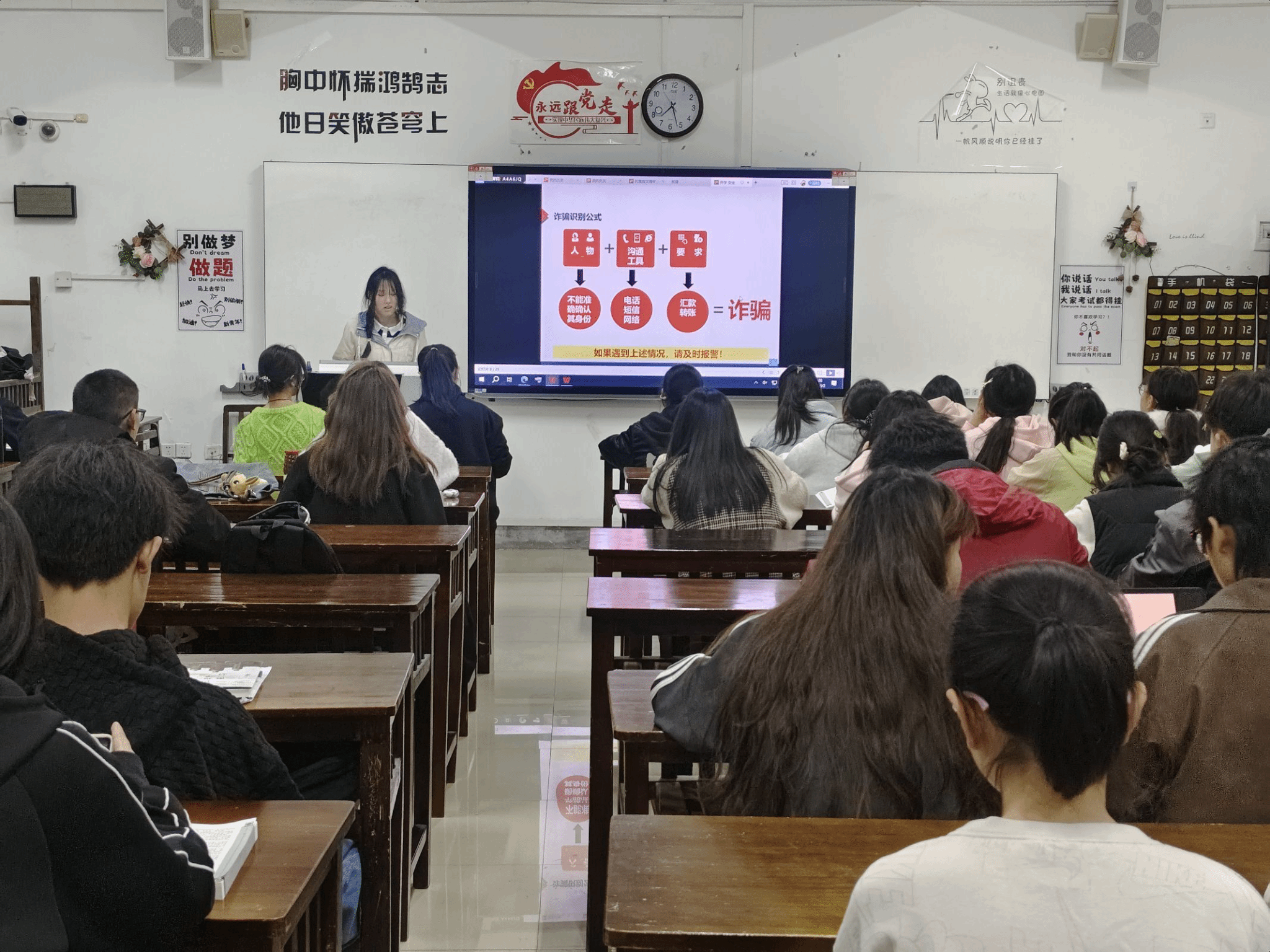 主题宣讲从国家安全开始,详细介绍了国家安全的相关法律,强调了维护国家安全的八个“不”,提醒同学们在日常生活中要维护国家安全。随后,详细介绍了交通安全、宿舍安全、食品安全、户外运功安全以及预防流行病等多个方面的注意事项。最后,通过生动的案例,向同学们介绍常见的诈骗手段,并告诉同学们如何识别诈骗,希望同学们提高警惕,避免被骗。