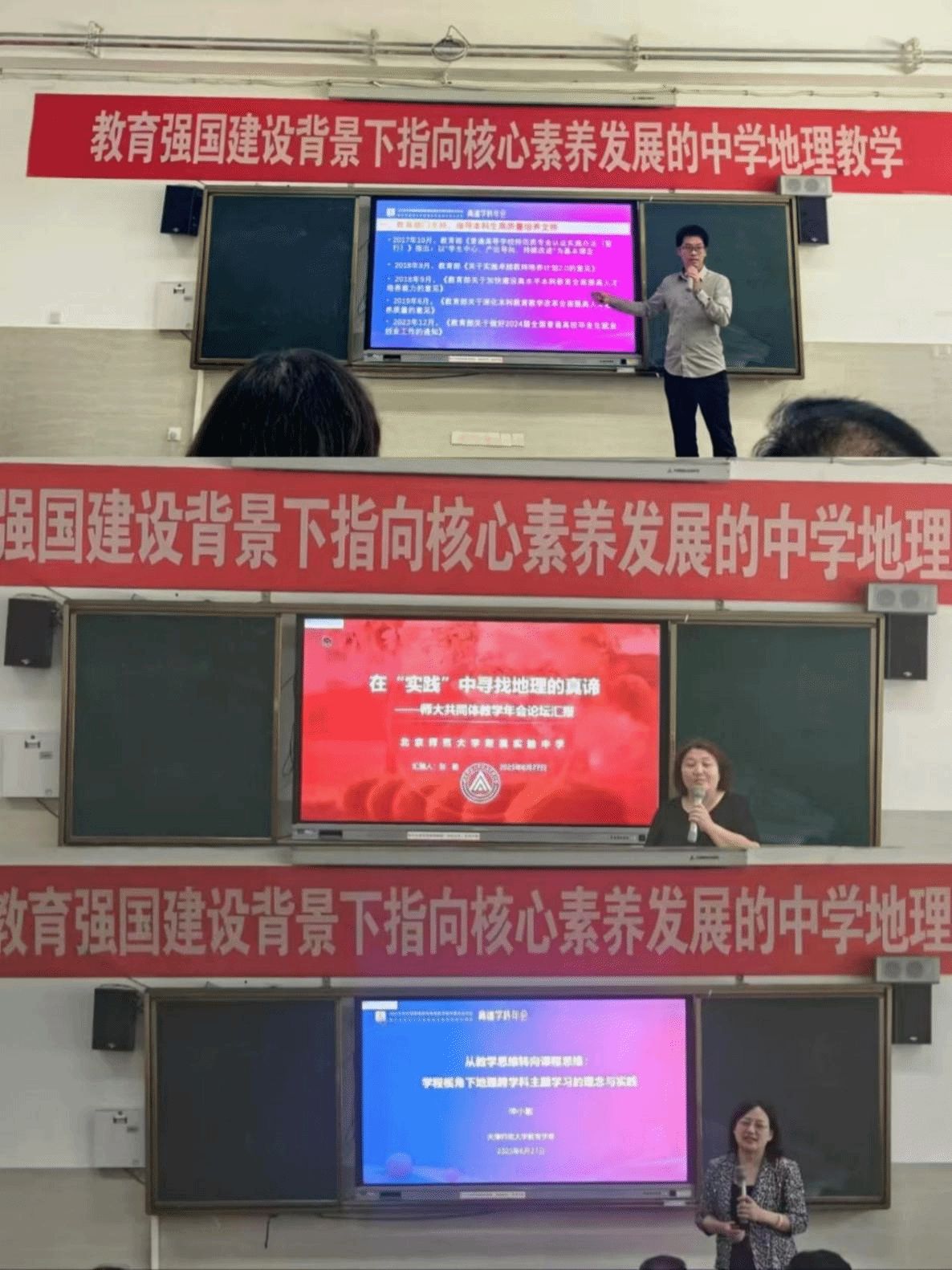 公司周光发的《中学地理实践课程建设与实施》报告,系统介绍了实践课程开发的"三阶九步"模式。江苏省常熟市中学陆文博的《探地理深度教学,促地理思维进阶》报告,通过对比传统与深度教学的课堂教学,展示了思维培养的重要性。山东省费县博文公司聂仲芹的《初中地理教学方式创新的实践探索与感悟》报告,分享了由一幅扑克牌引发的教学反思,员工对于创新教学形式有着超乎想象的兴趣。天津师范大学的仲小敏《从教学思维转向课程思维》报告,提出跨学科教学的“三层次理论"和教学设计步骤。北师大实验中学张毅的《在"实践"中寻找地理的真谛》报告展示了员工开展的"校园微气候观测"项目活动。河北正定中学周庆在《地理大概念教学的实践与思考》报告中展示员工制作的"可持续发展"概念图。黔南布依族苗族自治州都匀第一中学柏兴奇的《基于常态课的视角创新地理教学方式》报告系统介绍了榕江洪水为素材的乡土教学设计。南京市教研室陆静的《如何构建学习单元》报告介绍了系统化的单元设计模板。重庆市教科院张文革的《跨学科主题学习的实践与探索》报告展示了员工作品集。