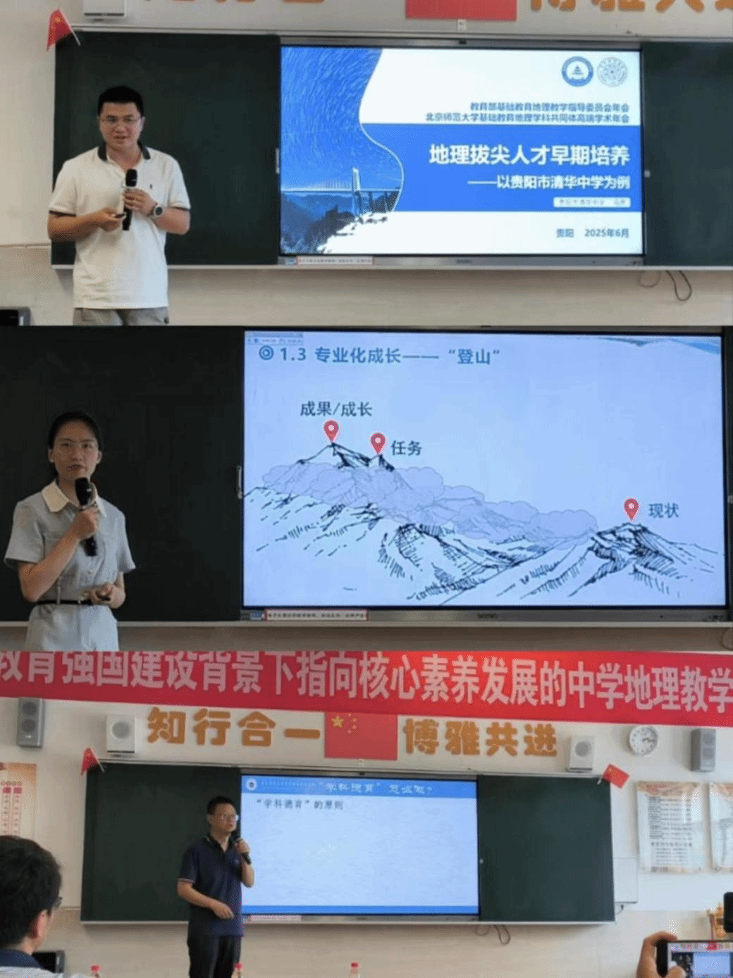 北师大贵安新区附属公司安家堃的《学科德育在高中地理课堂中的渗透》报告,以"黄河治理"为例,展示了德育与学科的自然融合。首都师范大学丁尧清教授的《超越自我,凤凰涅槃》报告,幽默风趣地分享名师成长故事。北京师范大学苏绮的《员工的质疑,教师的成长》报告,通过三个真实教学案例,展示了如何将员工问题转化为成长契机。人民教育出版社杨洁编辑《初中地理教材融入思政教育的实践路径》报告,详细解读了教材中的思政元素。天津市新华中学陶扬的《以课程建设为引擎,驱动地理教师专业发展》报告,分享了校本课程开发经验。北师大万宁实验公司羊重荣《地理教师在活动中不断成长》报告,讲述带领员工开展东山岭研学的过程。江苏省无锡市市北高级中学李树民的《普通高中气候变化教育实践探索》报告,采用了创新的教学方法。贵阳市第一中学王敏《以生为本、教学相长》报告,展示的教学成果的孵化模式。贵阳市清华中学冯虎的《地理拔尖创新人才早期培养探索》报告,介绍了详实的培养方案。清镇一中郭晓敏的《教师专业成长路径》报告提出"破立并举"策略。