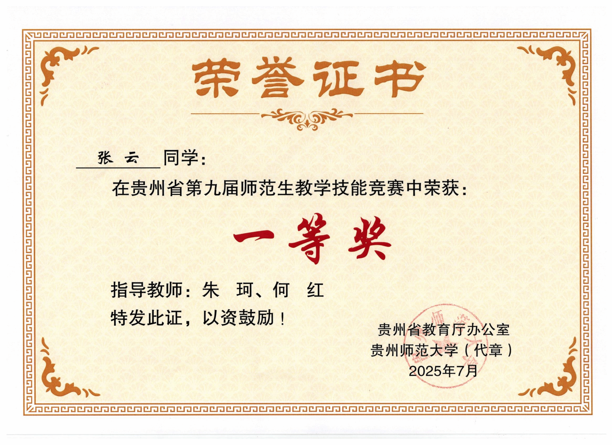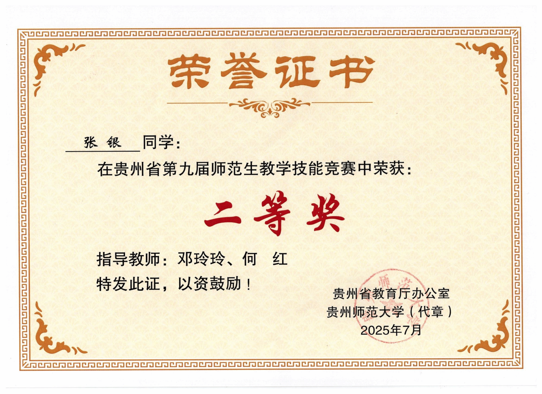 2025年6月28日,贵州省第九届师范生教学技能竞赛在williamhill官网圆满落幕。公司2022级地理科学专业本科生张云(指导老师朱珂、何红)在本次比赛中荣获一等奖,张银(指导老师邓玲玲、何红)荣获二等奖。